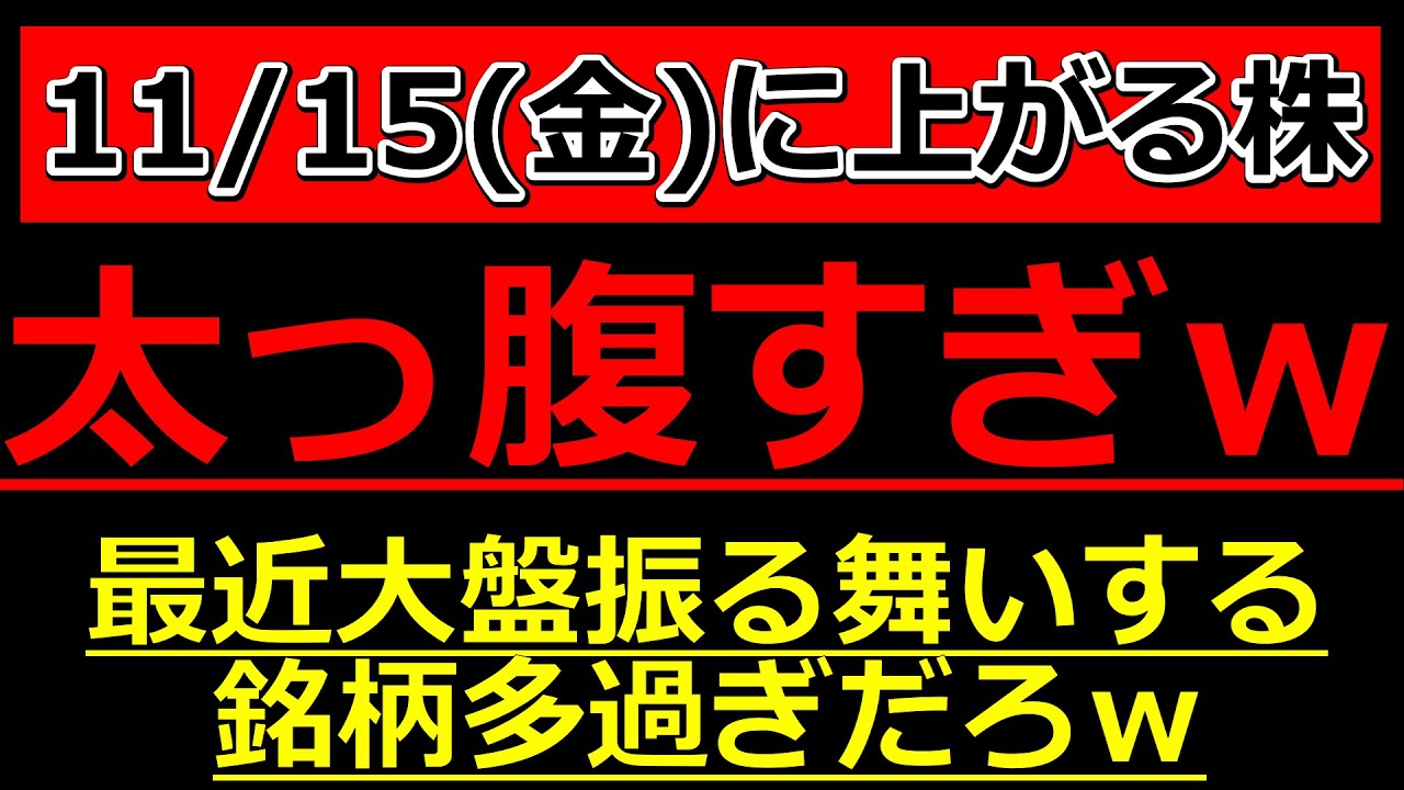 太っ腹すぎw最近大盤振る舞いする銘柄が多過ぎる件w【11/15(金)に株価が上がる株・明日上がる株・株式投資日本株最新情報】