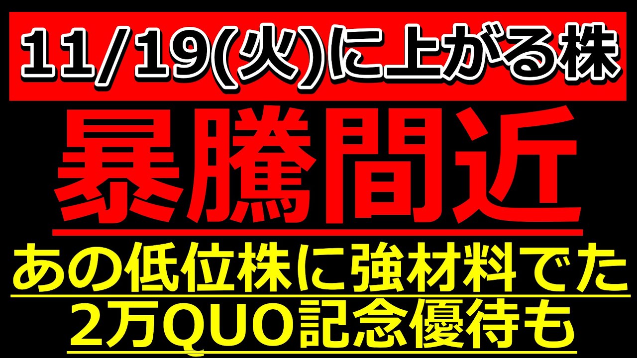 暴騰間近!あの低位株に強材料でた!2万QUO記念優待も!【11/19(火)に株価が上がる株・明日上がる株・株式投資日本株最新情報】