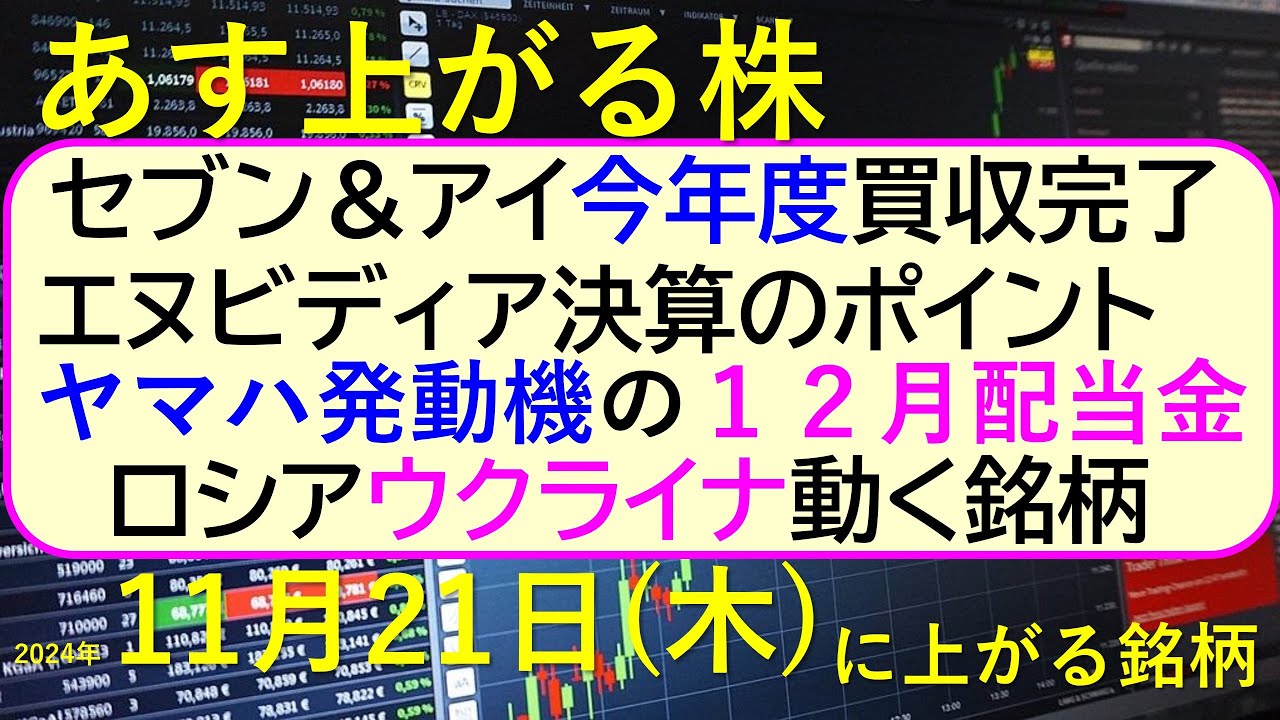 今日の引け後に出た材料で、あす11/21(木)に期待できる銘柄。ロシア・ウクライナ緊張で動く銘柄。セブン&アイは今年度に買収を完了。エヌビディア決算のポイント。ヤマハ発動機の12月配当金~あす上がる株。最新の日本株情報。高配当株の株価やデイトレ情報についてもお話しいたします。
