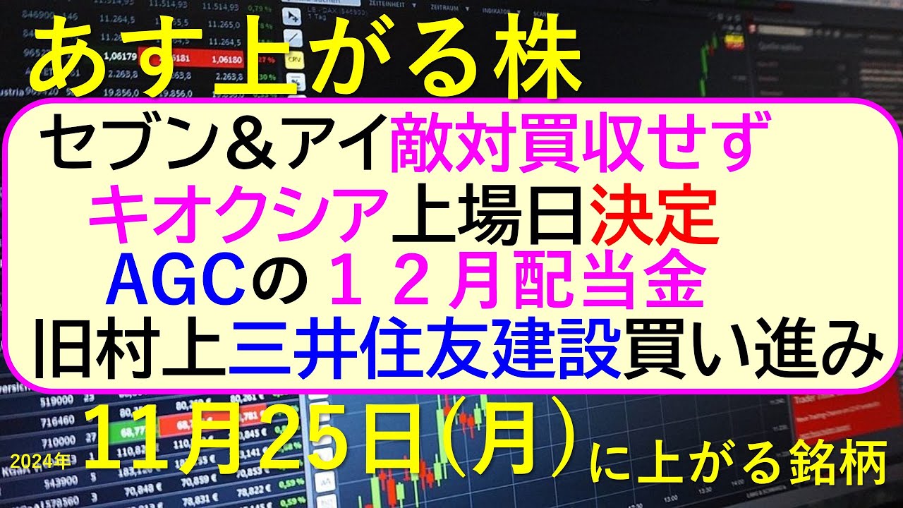 今日の引け後に出た材料で、週明け11/25(月)に期待できる銘柄。キオクシア上場日決定。セブン&アイ、敵対買収せず。旧村上が三井住友建設買い進み。AGCの12月配当金。~あす上がる株。最新の日本株情報。高配当株の株価やデイトレ情報についてもお話しいたします。