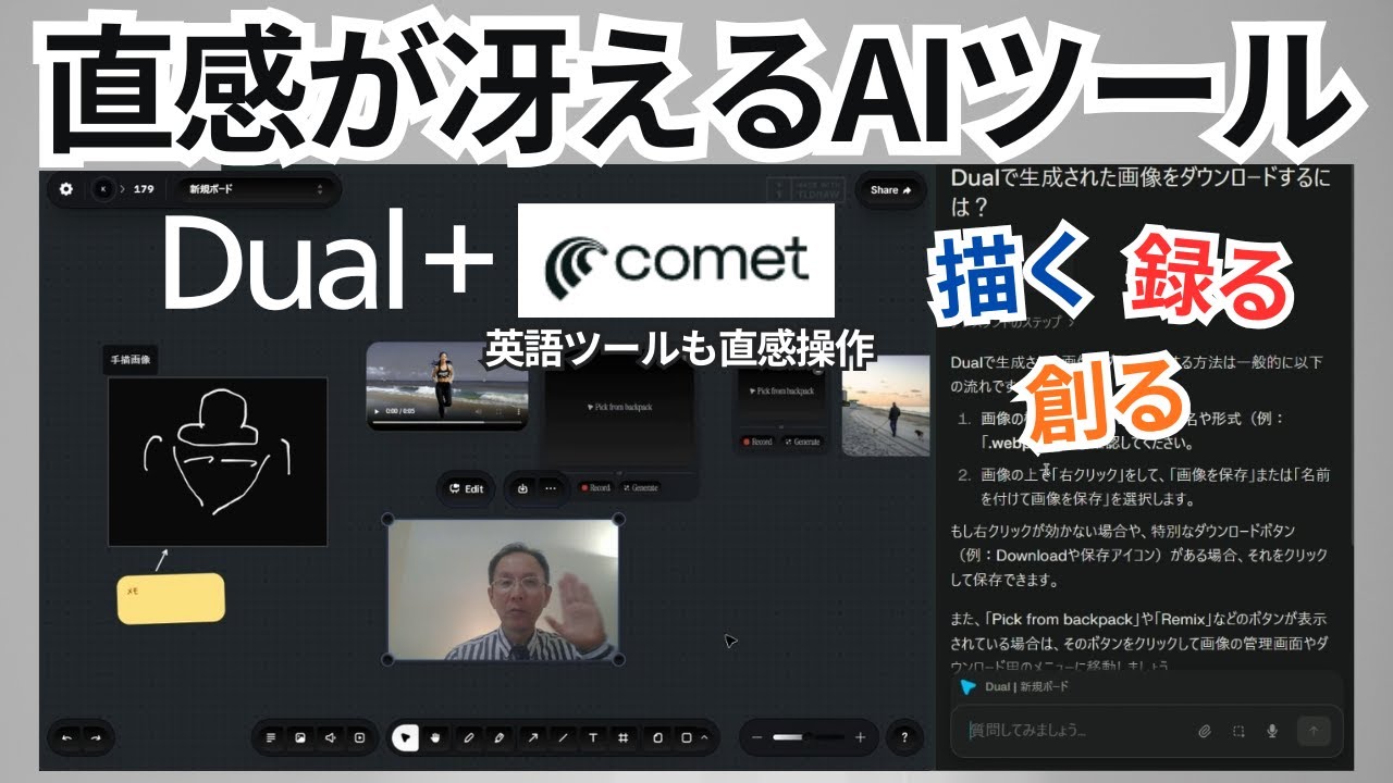 画像生成・録音・録画・手描きまで統合したDualの直感的なプロ向け創作環境を紹介します。更に、AIブラウザのCometと組み合わせれば英語ツールも自在に操作。AIブラウザを使って言語の壁を越えた創作が可能です。