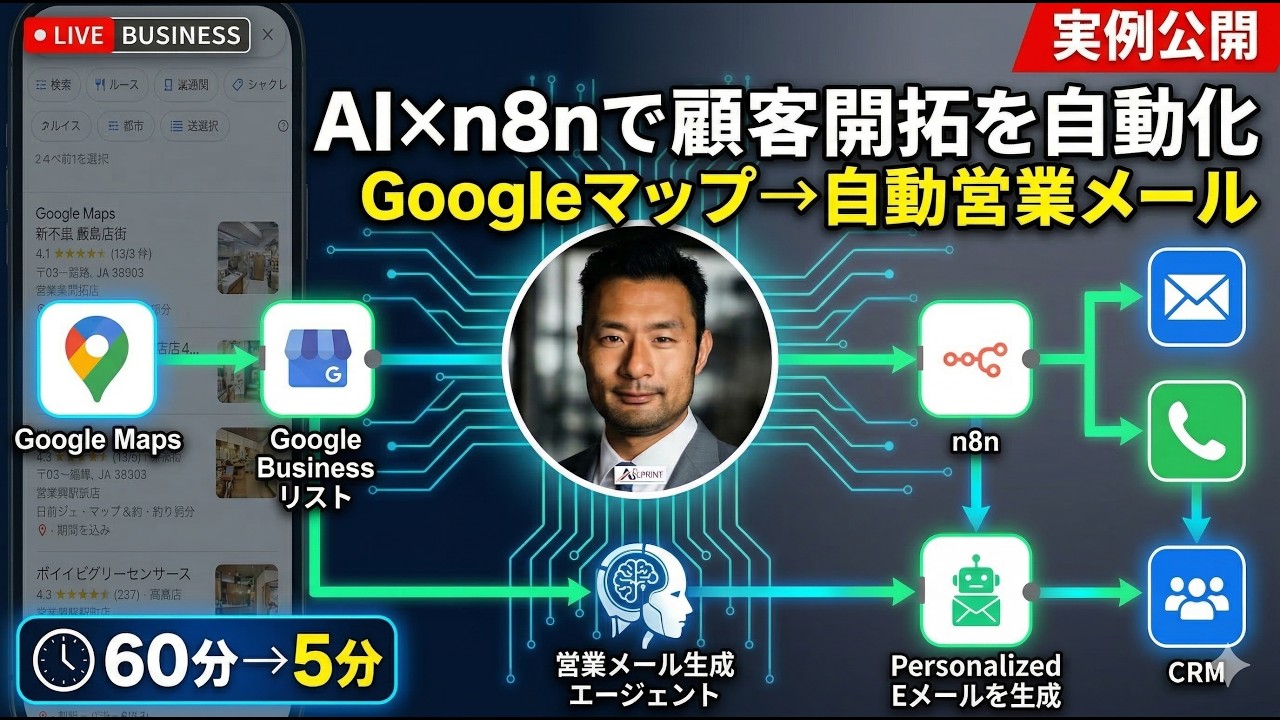 今回は、その中でも新規顧客開拓(コールドアウトリーチ)を自動化するn8nワークフローに焦点を当て、どのように潜在顧客を見つけ、パーソナライズされた営業文を自動生成し、CRMに連携させているかを具体的にお見せします。