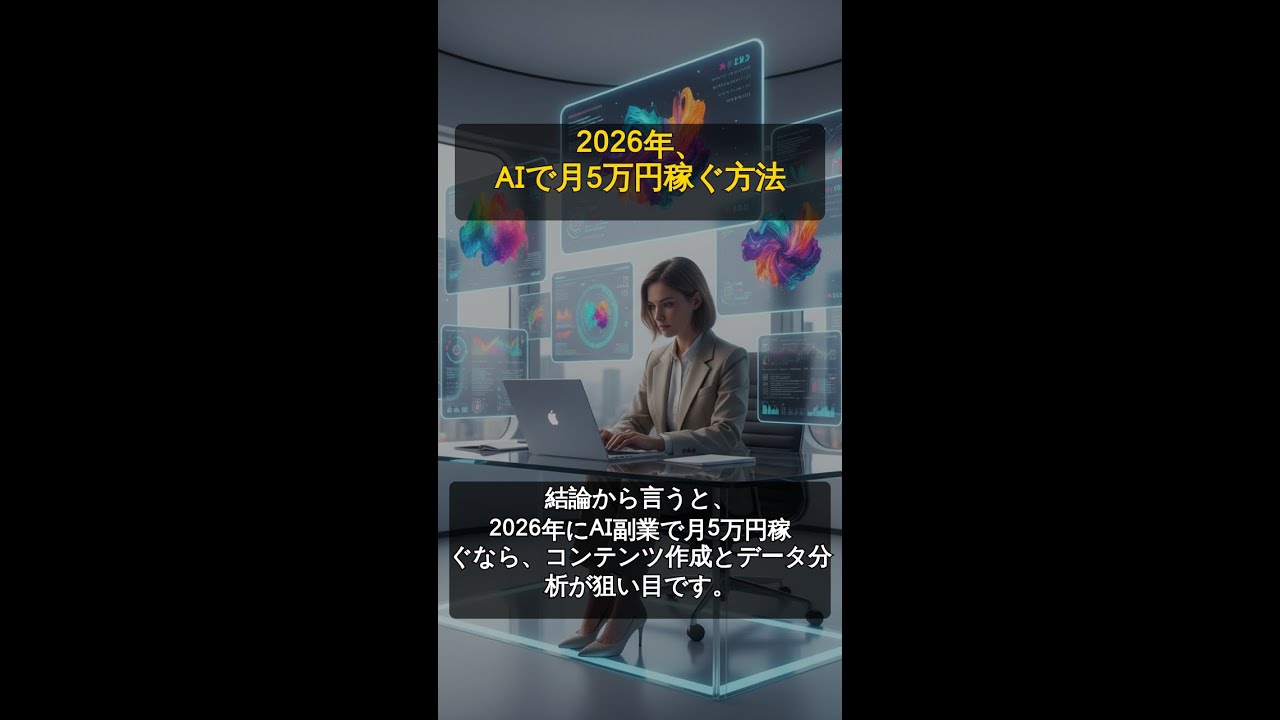 2026年、AIを活用して月5万円を稼ぐ具体的な副業方法を紹介。ChatGPT-4oやStable Diffusion 3などの最新AIツールを使ったコンテンツ作成やデータ分析の仕事に焦点を当て、実践的なステップと注意点を解説します。AIスキルを身につけて収入アップを目指しましょう!