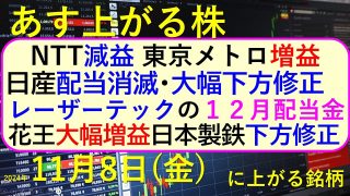 あす上がる株 2024年11月8日(金)に上がる銘柄。NTTが減益、東京メトロは増益。日産が下方修正し配当は未定。花王は増益、日本製鉄は下方修正。~最新の日本株情報。高配当株の株価やデイトレ情報~